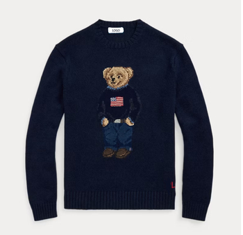 Maglioncino blu Navy OEM & ODM maglione lavorato a maglia per coppie abbinate Design orso bandiera americana con motivo 3D e Logo anteriore