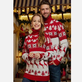 เสื้อสเวตเตอร์แบบสวมหัวถักหนากันการหดตัวลายเสือดาวคริสต์มาสฤดูหนาวสีแดงและสีขาว